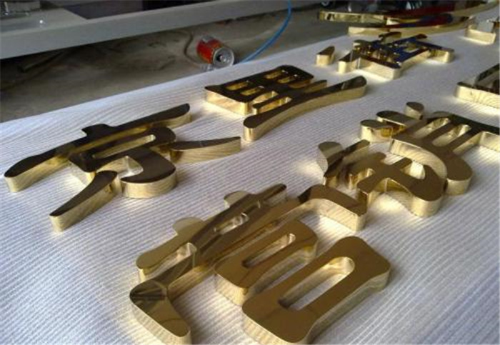 不锈钢字,有钛金字,不锈钢精工字,不锈钢较镀锌板而言可谓贵金属,加上其金属质感较独特,故一直以来较多人愿意让它以本来面目出现,不锈钢,人们利用其"不锈"的特点,采用抛光(发纹)面即哑光处理,或直接采用8K(镜面)处理,让其炫目多彩,这种类型属建筑流派中的光亮派的一种,但两种处理有个共同缺点,缺乏个性,因为多年来人们多选用这种工艺,固其个性不彰显;在户外灿烂的阳光下,可能因金属的折射原因,令文字笔画不清晰,而在阴雨天,金属因失去光泽或蒙灰的缘故同样显得模糊。