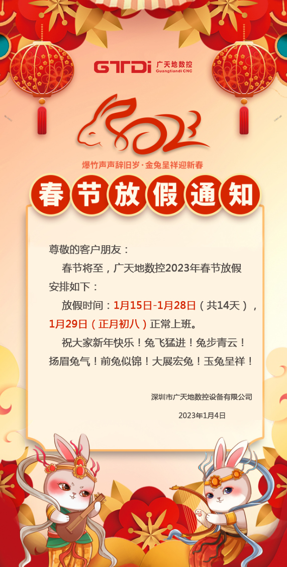 2023年春节将至,首先感谢您在2022年里的鼎力支持和愉快合作,星空电子数控全体同仁在此给您拜个早年。在新年的一年里,星空电子将更加努力,为您提供更优质的服务。按照国家春节放假规定结合我司的具体情况,春节放假时间安排如下: